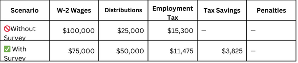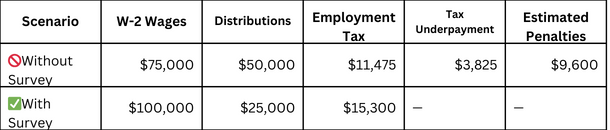 Key Insight: A compensation survey helps ensure W-2 wages are appropriately set—not higher than necessary—allowing for optimized distributions and reduced employment tax liability.